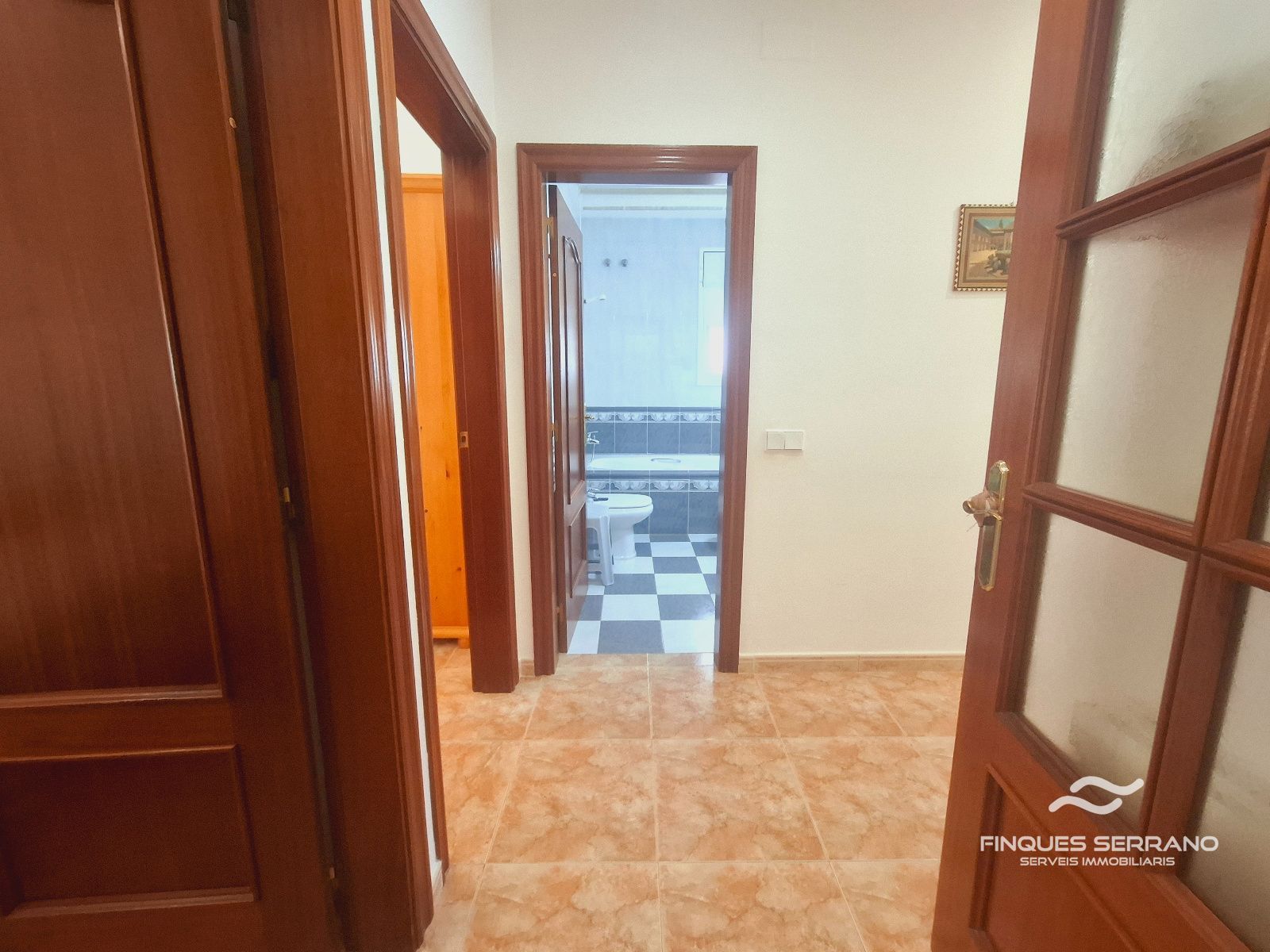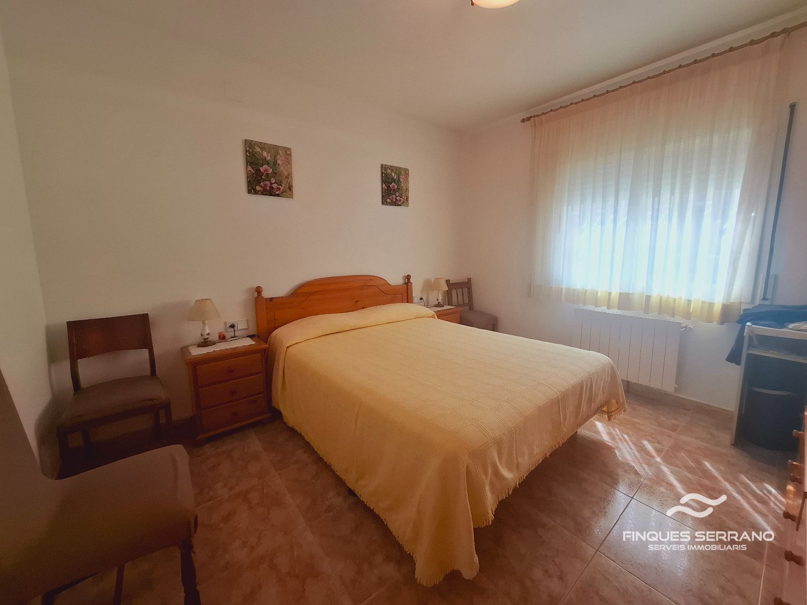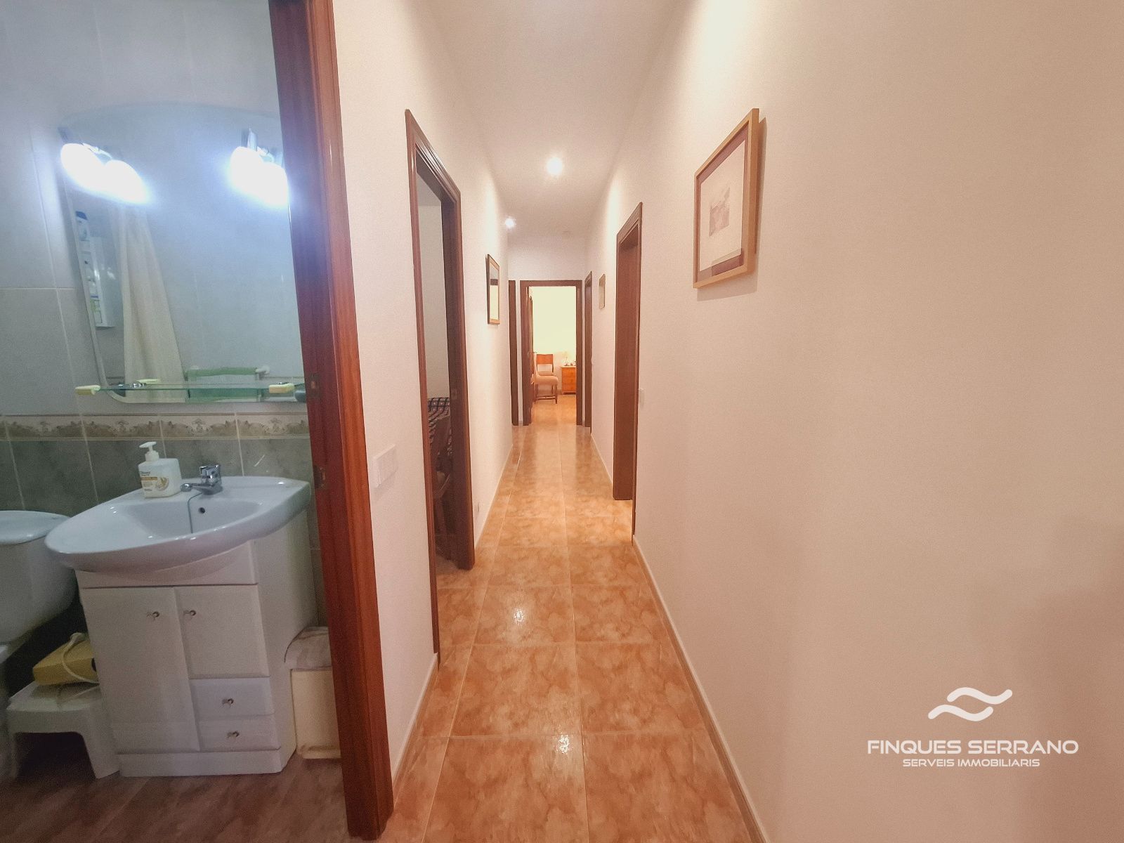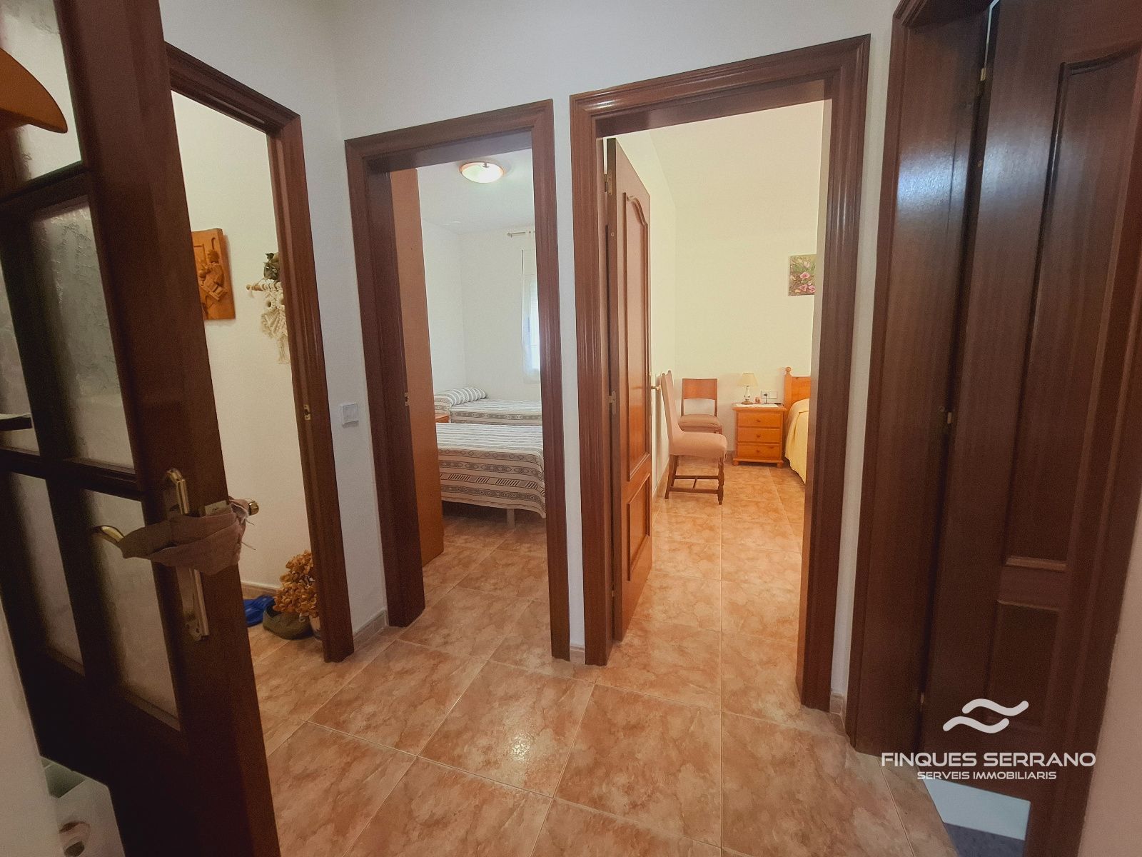 La vivienda principal, distribuida en una sola planta a nivel de calle, ofrece una distribución práctica y elegante. Un amplio recibidor da paso a un cuidado distribuidor que conecta con tres luminosas habitaciones dobles, todas con excelente orientación solar, y dos baños completos, uno equipado con bañera y otro con plato de ducha.