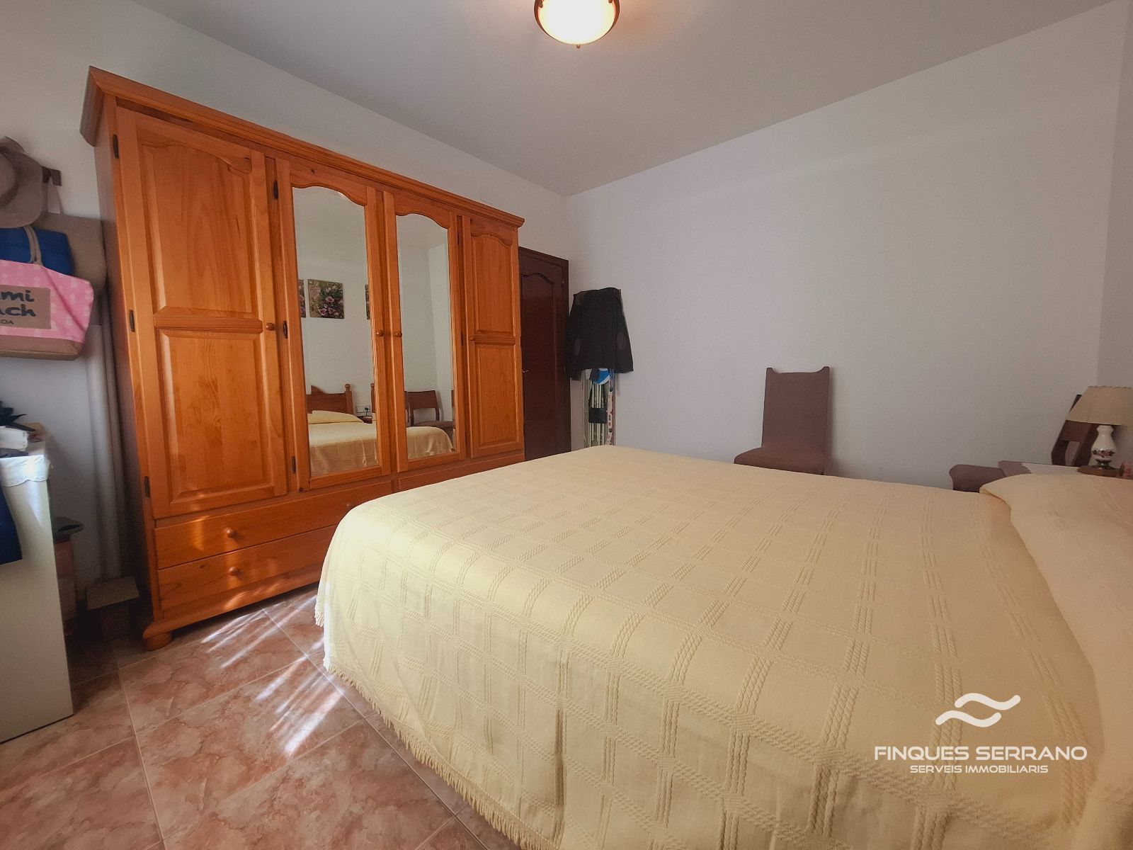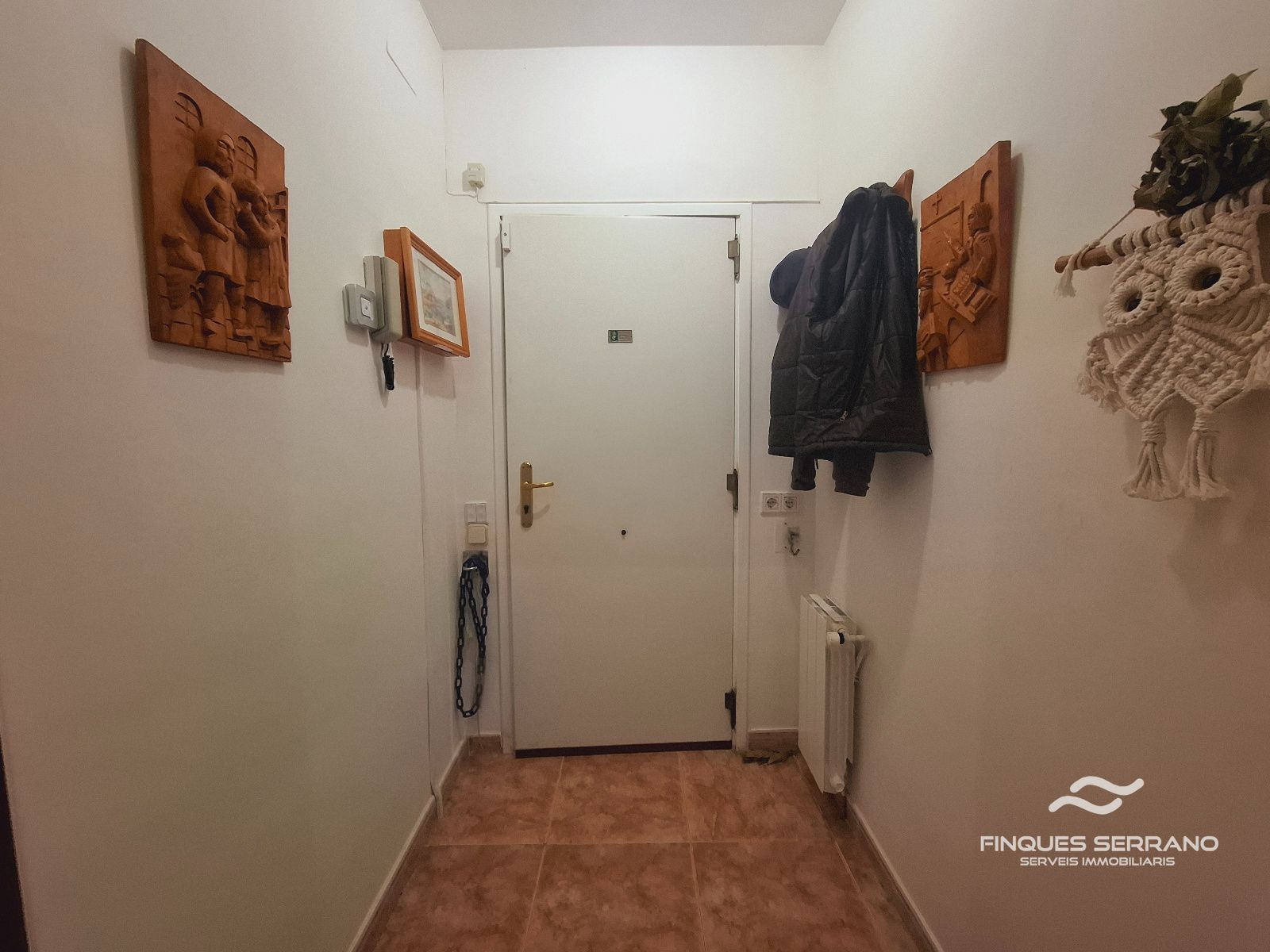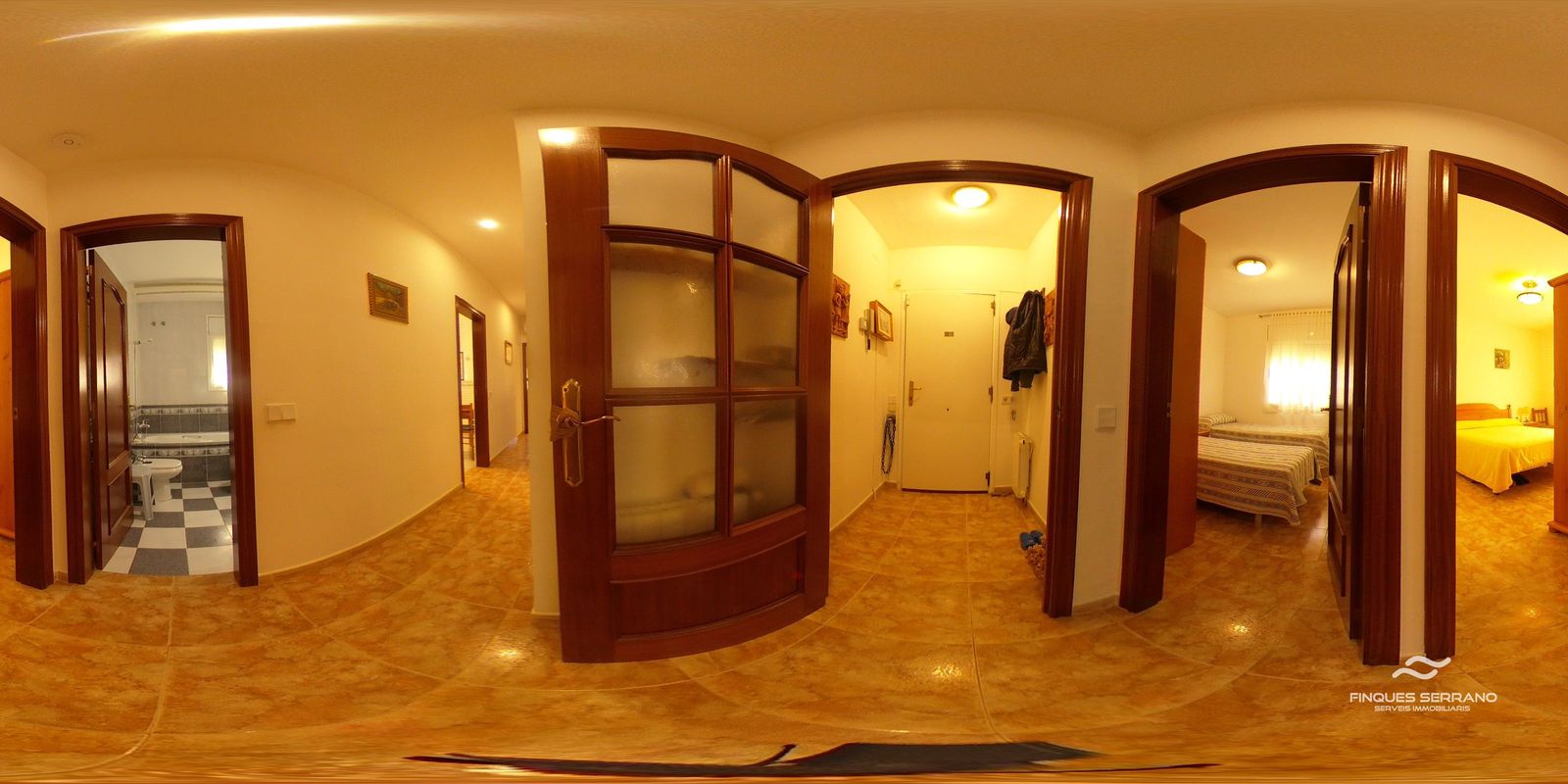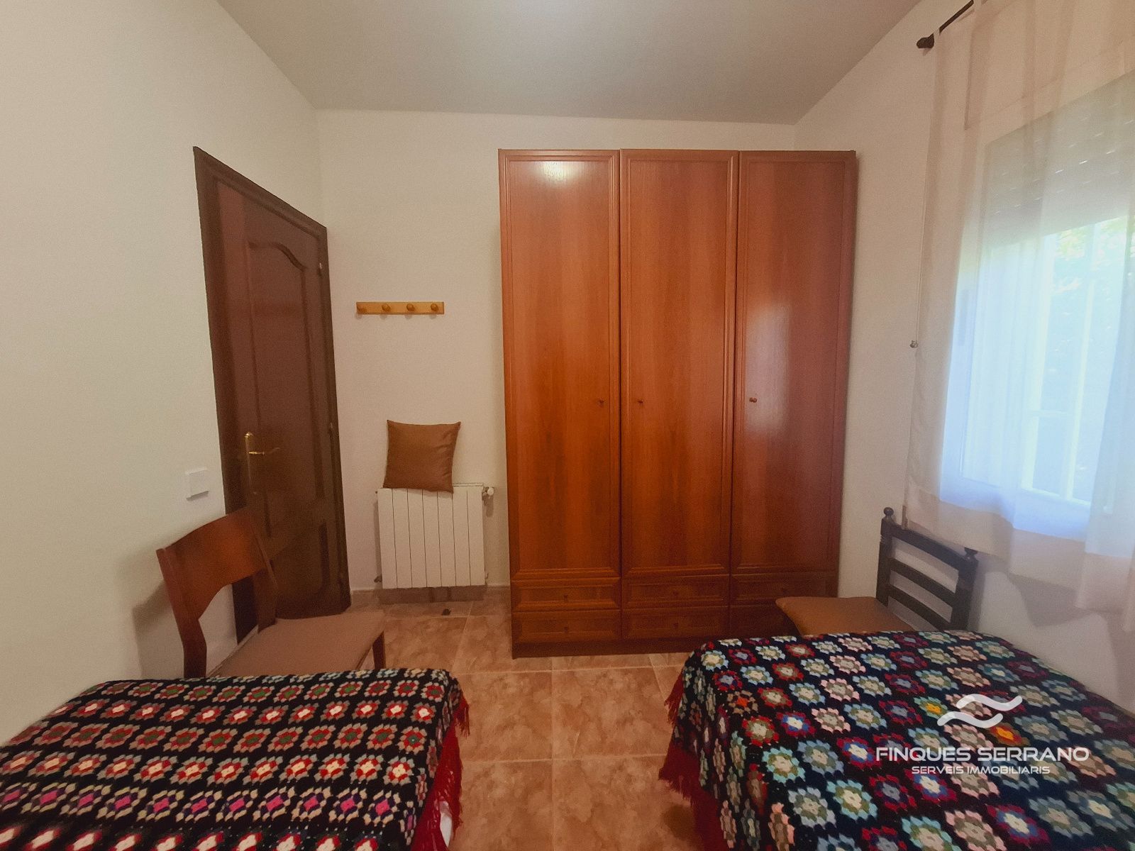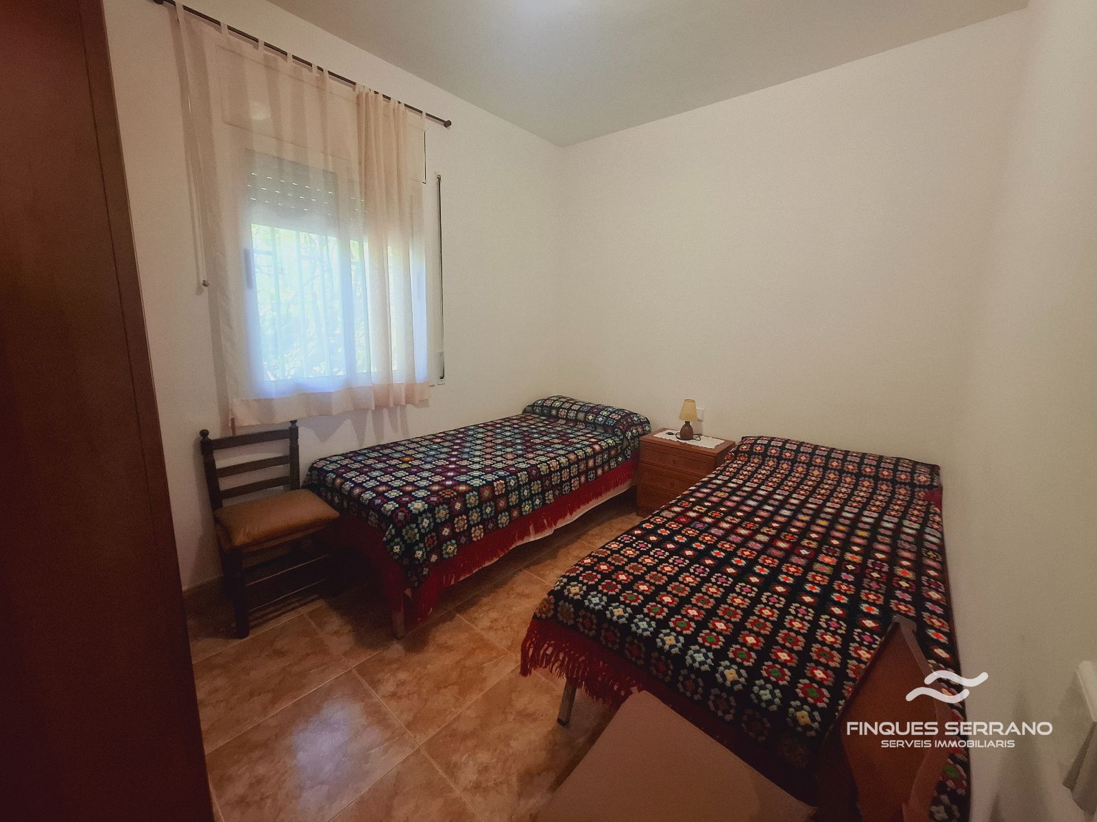 La vivienda principal, distribuida en una sola planta a nivel de calle, ofrece una distribución práctica y elegante. Un amplio recibidor da paso a un cuidado distribuidor que conecta con tres luminosas habitaciones dobles, todas con excelente orientación solar, y dos baños completos, uno equipado con bañera y otro con plato de ducha.