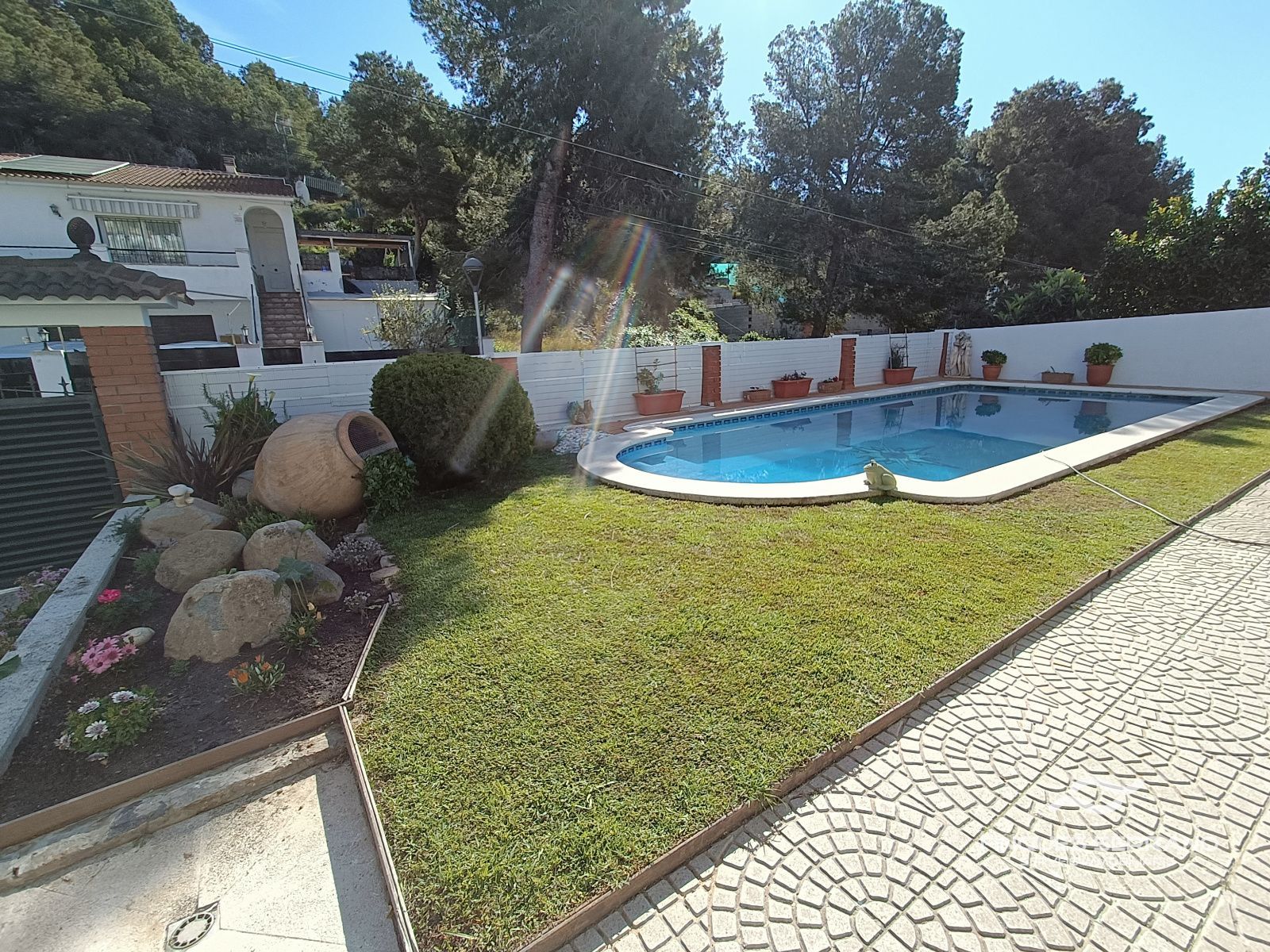 La planta a pie de calle es una vivienda en sí misma, contando con su propio salón-comedor con cocina americana, un baño completo y dos habitaciones adicionales. Este nivel está diseñado para el disfrute y la practicidad, incluyendo una bodega, trastero, almacén y un amplio garaje con capacidad para dos coches. Sin embargo, es en el exterior donde la propiedad despliega todo su encanto: una magnífica piscina de 8x4 metros rodeada de zona verde, una terraza y un comedor de verano con barbacoa pensado para exprimir al máximo el clima mediterráneo en compañía de amigos y familiares.